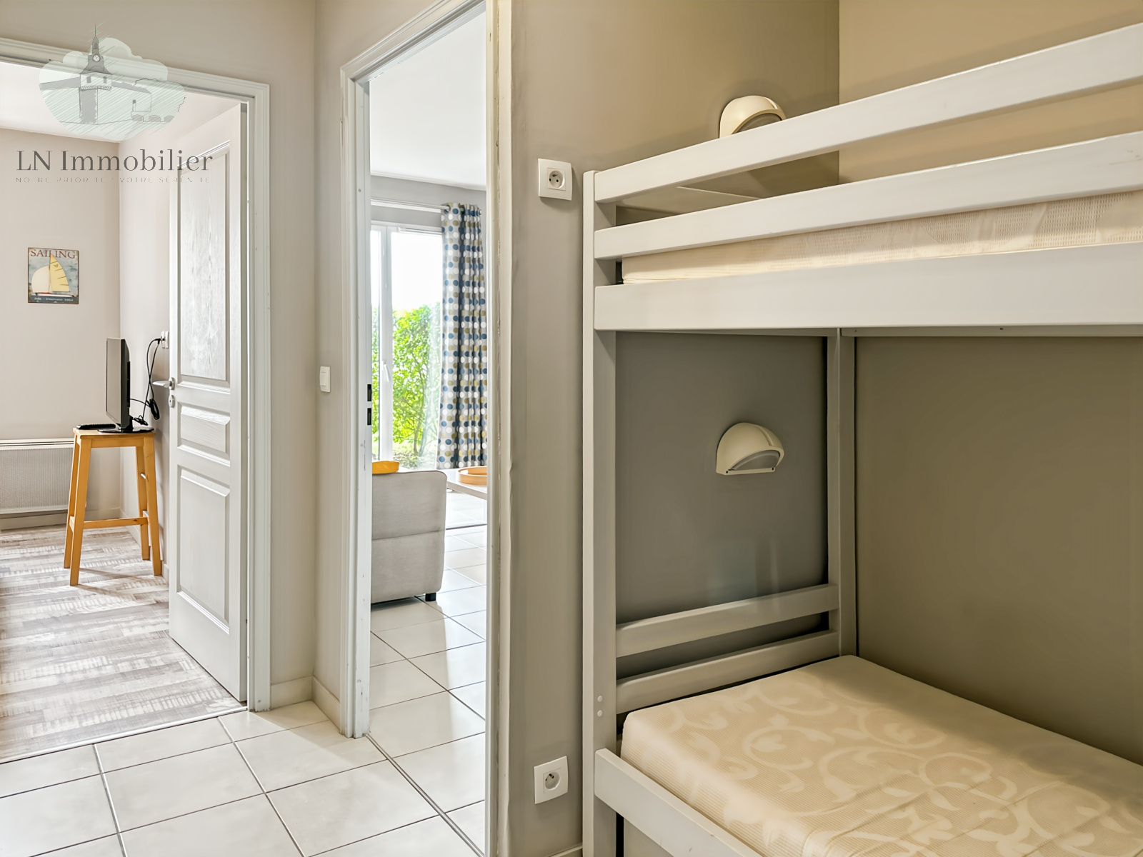 L'entrée dessert une pièce de vie d’environ 17 m² avec kitchenette,avec une terrasse privative d’environ 6 m², une chambre, une salle de bains, deux lits simples superposés et un WC indépendant.