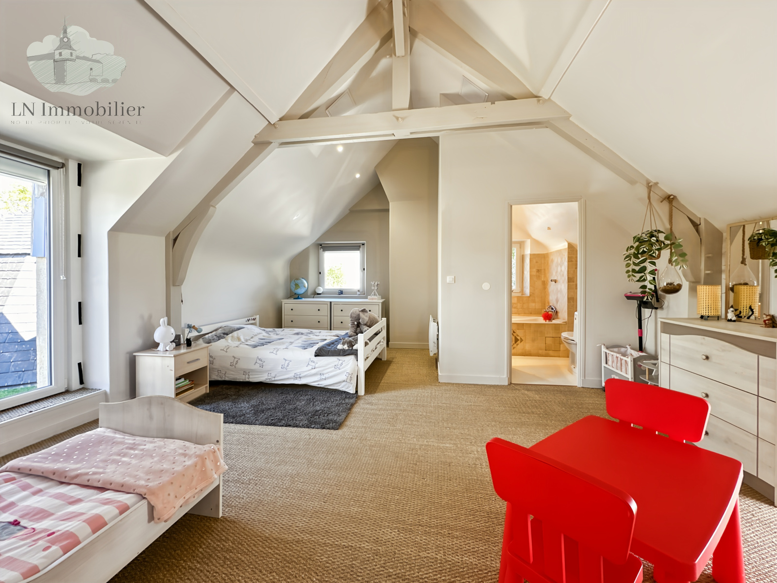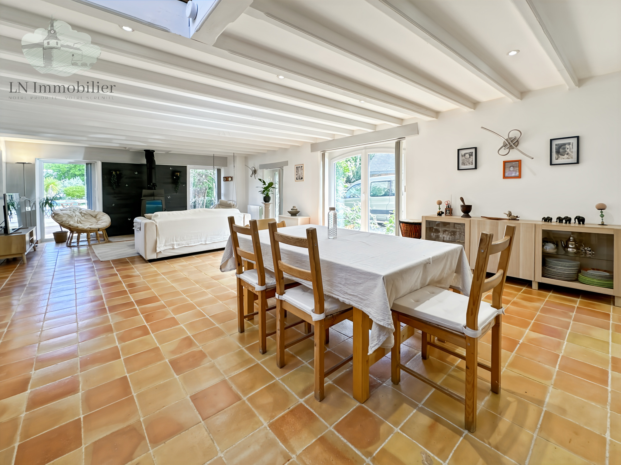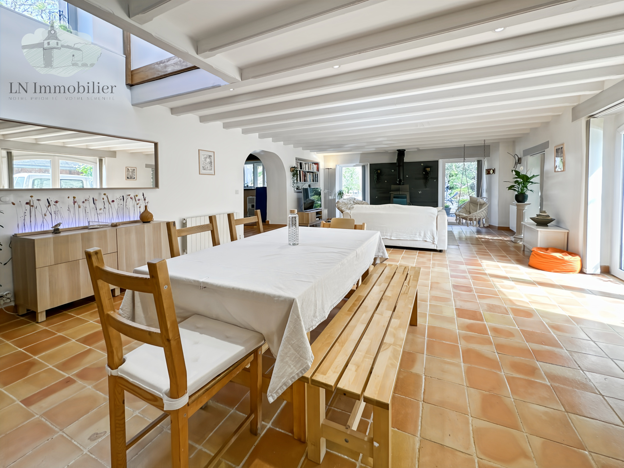 À l'étage, une grande mezzanine et une suite parentale avec salle de bains et accès à une terrasse de 20 m² environ.