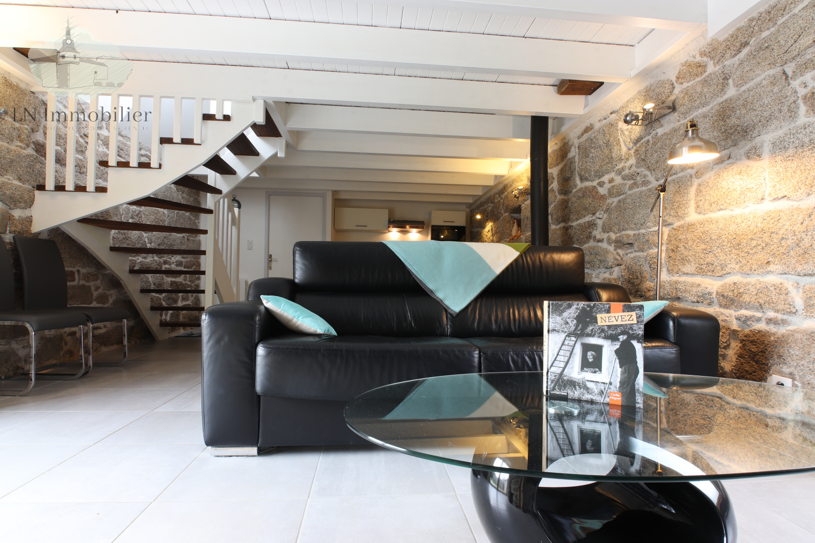 cuisine ouverte sur la pièce de vie poêle à pellet. tomette