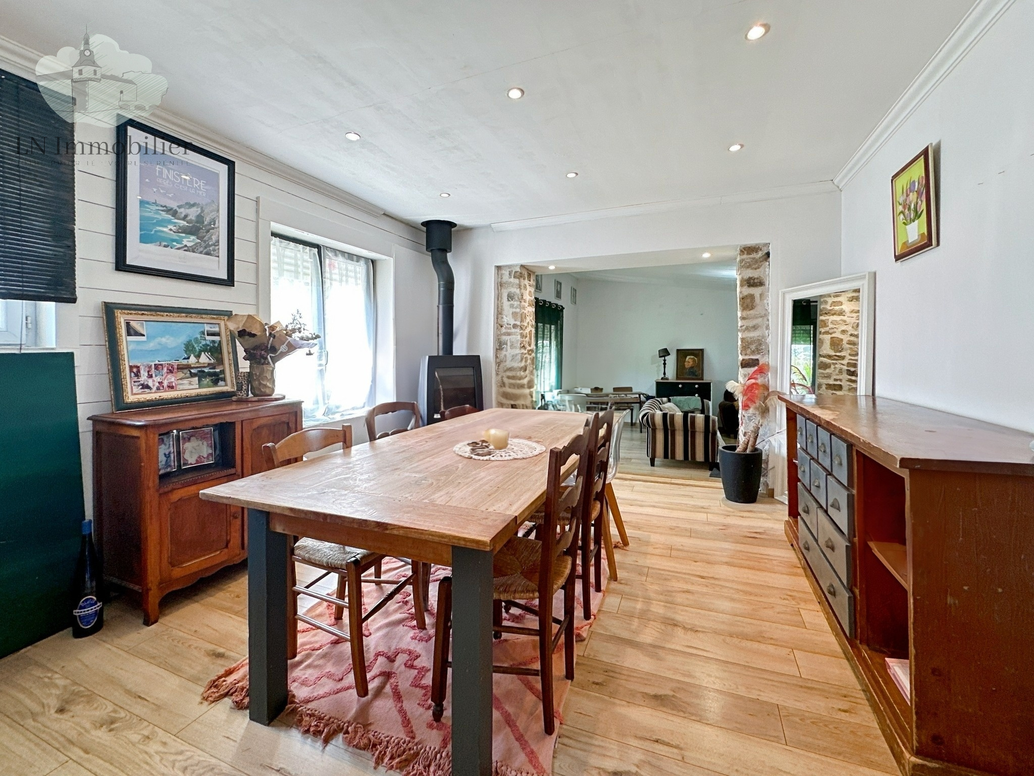 L'entrée ouvre sur un salon/séjour d'environ 47m² avec poêle à bois, une cuisine aménagée et équipée, un cellier.